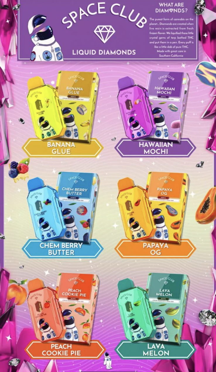 - Space Club Carts – Papaya OG: Earthy, fruity punch; compatible with 510 batteries.