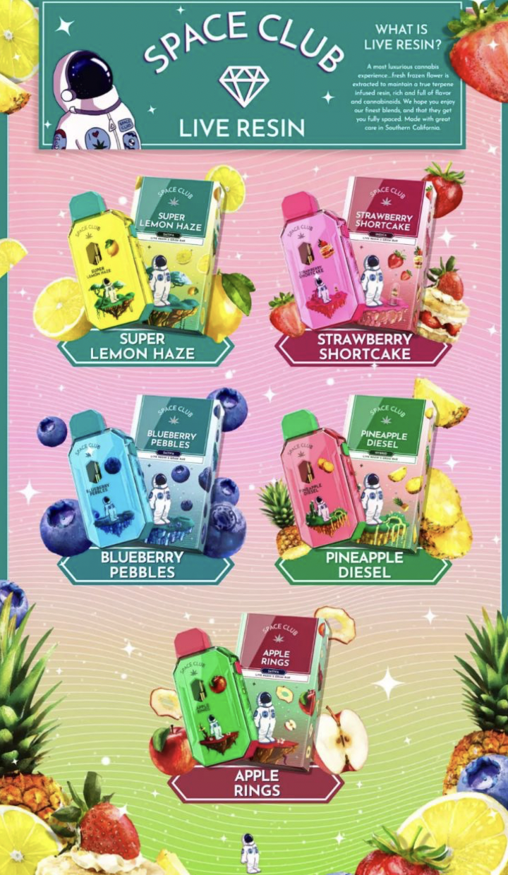 - Space Club Live Resin Disposable – Hawaiian Mochi: Tropical, creamy flavor with uplifting effects.